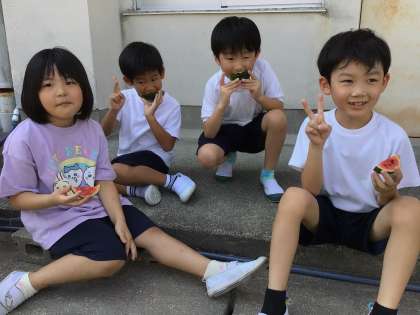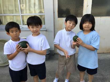 教室の横の花壇で育てていたスイカが育ったので、収穫しました。少し味見…のつもり、がなかなか美味しくできていて、みんなで食べました。