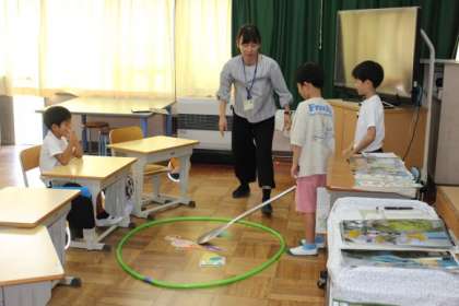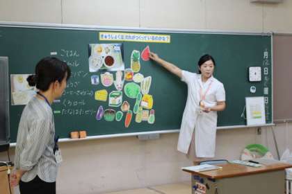 「きゅうしょくは、だれがつくっているのかな?」をテーマに、栄養教諭の方のお話を聞きました。食材をかき混ぜるときに使う大きな調理器具を見て、子どもたちはびっくり。緊張しながら実際に持って、かき混ぜることもしました。授業の終わり頃、公務手さんが給食を運んでくると、子どもたちから「ありがとう」の言葉が。