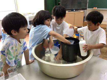 いろいろな入れ物のかさを比べました。どうやったら比べることができるかな?様々な方法を試したり、みんなで話し合ったりしました。