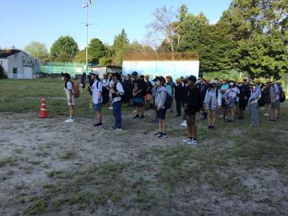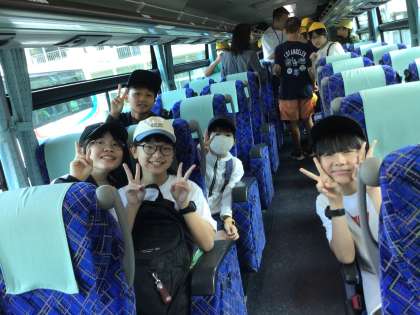 澄んだ青空のもと、待ちに待った修学旅行が始まりました。出発式では、滝脇小が代表のあいさつをしました。