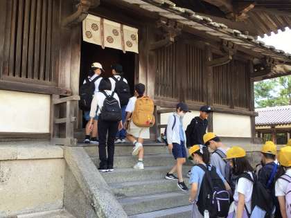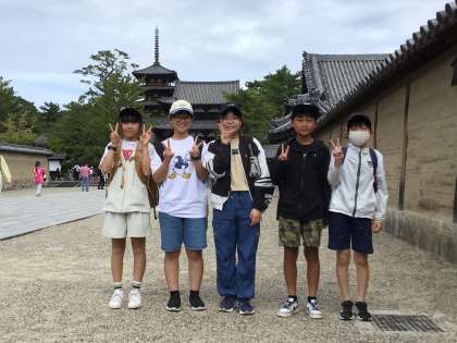 法隆寺を見学しました。ガイドさんから説明を聞きながら、世界最古の木造建築物を自分の目で見て、学びました。