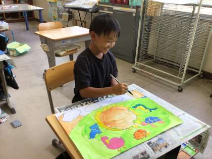 図工の授業で、読書感想画を描いています。今年は、「おひさまパン」というお話の絵を描くことになりました。「絵から気持ちが伝わるように描こう」を目標にしています。完成が楽しみです。