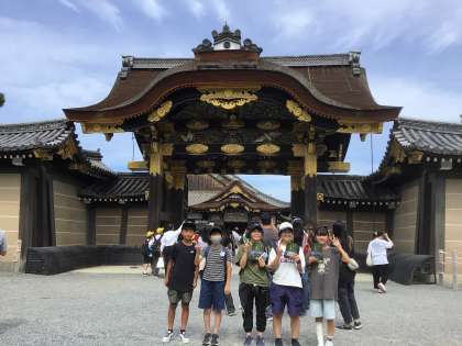 二条城の唐門前で記念撮影。このあと、タクシーの運転手さんに案内してもらいながら、うぐいす張りの廊下を歩き、大政奉還が行われた部屋などを見て回りました。