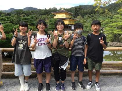 最後の見学場所は、金閣寺です。美しい金色の輝きに、子どもたちは感動していました。また、ガイドさんの案内で、龍門の滝や茶屋などを見て回りました。
