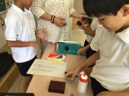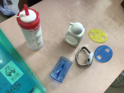 講師の方に持ってきていただいた、目の不自由な方が使っている便利グッズを実際に手に取ることができました。洗濯の時に靴下のペアをセットで洗えるような道具や、触れると物の色を音声で読み上げてくれる機械など、初めて見る物がたくさんありました。