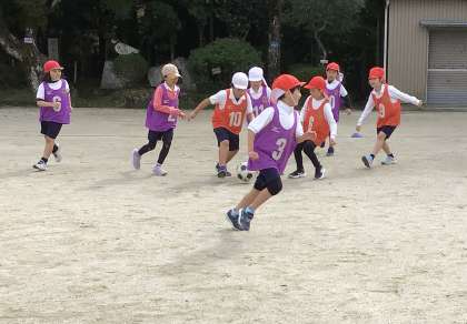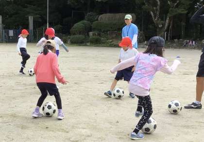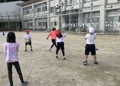 グランパスから2名のコーチに来ていただき、サッカーを教えていただきました。ドリブルやシュートの仕方はもちろん、サッカーボール投げたり、キャッチしたりして、いろいろな動きを体験しました。