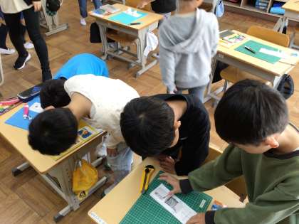 カッターナイフを使って紙を切って、窓を作りました。また、その奥にどんな景色があるか想像して、描きました。