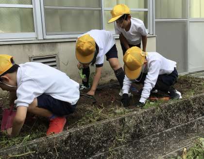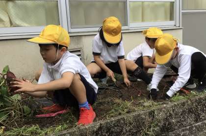 教室の隣にある小さな花壇に植えたさつまいも。掘ってみると、たくさんのさつまいもに出会えました。宝探しのようで、楽しかったですね。