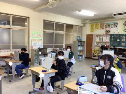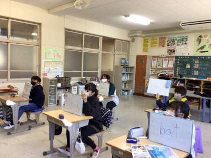 外国語の授業では、英語クイズをしました。クイズの答えをミニホワイトボードに英語で書きます。英語を書く練習をしながら楽しくクイズができました。
