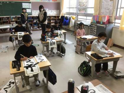 3年生は、毛筆で初めての書き初めです。3年生も4年生も、半紙に向かい、集中して筆を動かしていました。