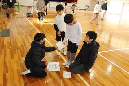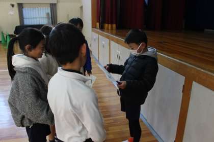 1月のいきいき集会では、保健委員会の発表がありました。保健委員が体育館のすみずみに散らばり、「姿勢が悪いとどうなる?」など、姿勢に関する問題を出します。保健委員以外の子は、「フレンドクエスト」のカードを持って保健委員のいるところをまわり、問題に答えていきます。楽しみながら、姿勢について考えることができました。