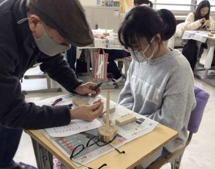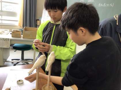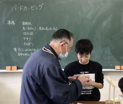 バードカービングの先生とボランティアさんに来校していただき、丁寧にご指導を受けながらの制作です。