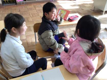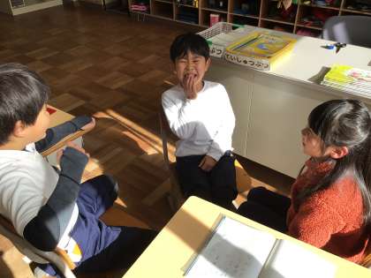 国語の学習で、三音の言葉を探してしりとりを行いました。「たまご」「しっぽ」「じゅぎょう」など、工夫して探していました。