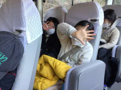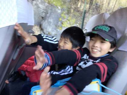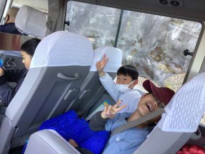 3・4年生は、校外学習で小原に行きました。行きのバスの中で楽しく過ごしました。