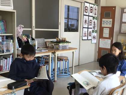 3・4年生は、国語の授業で「ゆうすげ村の小さな旅館」の学習をしています。このお話は、今年度に学習する最後の物語文です。今日はグループで音読をして、物語の面白さを伝え合うことができました。