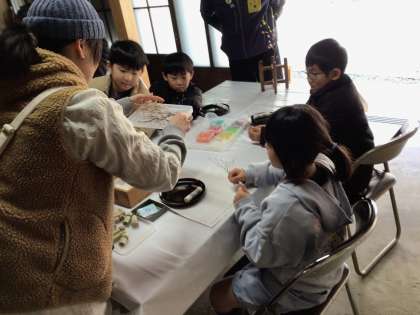 花餅作りを体験しました。餅ではなく、和紙を使った花餅です。どの色にしようかな〜どこにつけようかな〜と夢中になって作りました。