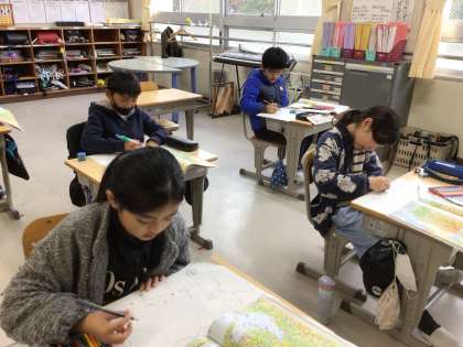 3・4年生は、社会の授業で愛知県の特色について学習しています。これまでに交通や土地利用について学びました。今日は、地図帳を見ながら愛知県の農業についてまとめました。海に近い場所で農業が盛んなことに気付き、その理由を話し合うことができました。
