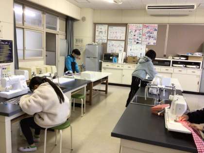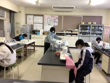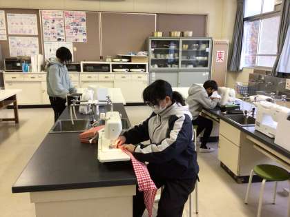いよいよ卒業が近づいてきました。滝脇小学校に何かプレゼントしたいという思いから、ペーパータオル入れを作ることにしました。ミシンを使って一人一人が制作しています。
