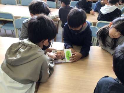 司書さんに図書館指導をしてもらいました。本の分類が表紙にある数字と同じことに気付き、本がどこに置かれているか知りました。