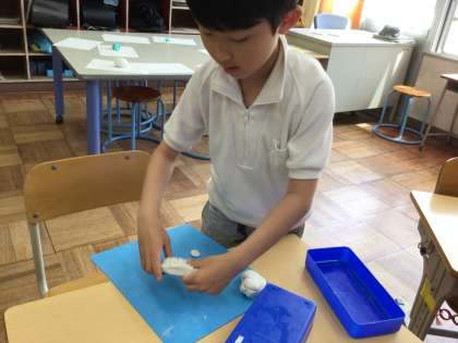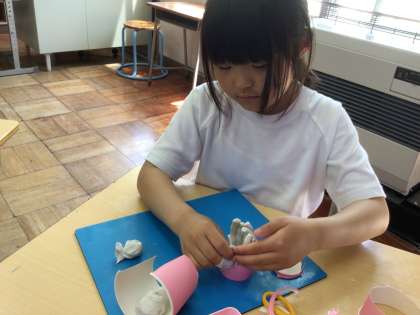 粘土をいろいろな形に変え、ごちそうをつくりました。子どもたちは「お寿司食べたいな!」「キャラクターのかわいいクッキーを作ろう!」と楽しんでいました。細部までこだわりが詰まった、美味しそうなごちそうができました。