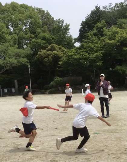 チームに分かれてバトンパスの練習をしたり、走順を話し合ったりして、リレーのスタートです。友達の声援を受け、思い切り走りました。