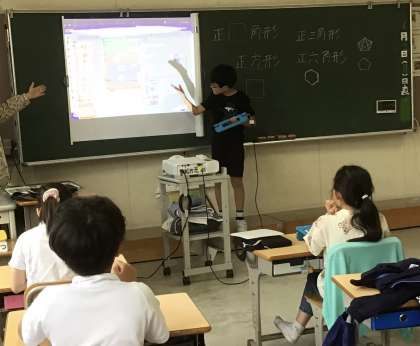 簡単な仕組みを聞いた後、正方形を描くプログラムを作りました。その後、三角形や長方形の描き方を考えました。一人でじっくり考えたり、友達と相談したりしながら、新しいプログラムを考えていました。