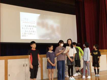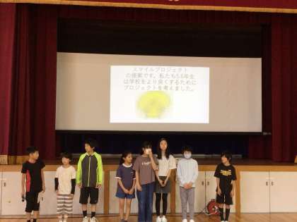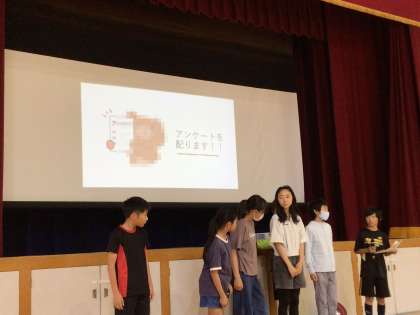 今日の学校集会の時間に、高学年の有志が全校の友達・先生方に向けて「プロジェクト」を発表し、みんなの意見集約のためのアンケート調査について、提案していました。