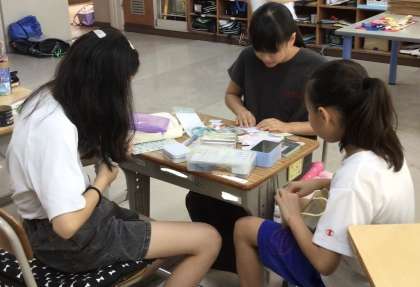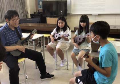 体育館では地域講師の方に卓球を教えていただいていました。音楽室ではウクレレで「カエルの合唱」の演奏、教室では物作りに没頭していました。