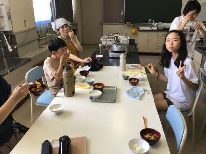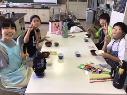 鍋でご飯を炊き、グループ毎で作った味噌汁。