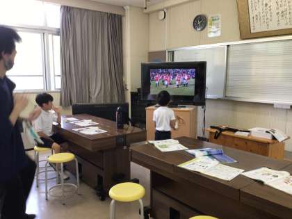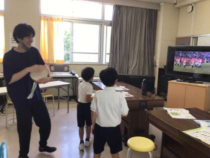 低学年は、音楽の学習で 世界の音楽に慣れ親しんでいました。太鼓やタンブリンを叩きながら 映像に合わせて踊る姿はとても愛らしいものがありました。
