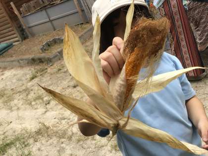 栽培していたのはポップコーン用のトウモロコシです。かたい実にびっくりする子どもたち。「あれ?なぜか砂が!」と、驚き子もいました。皮をむくと白い粉がありました。なんだろうと子どもたちは考えていました。