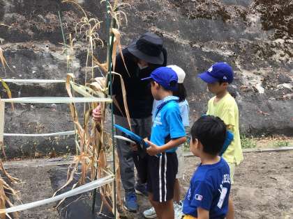 2年生は、畑で栽培していたトウモロコシをじっくりと観察した後、収穫していました。