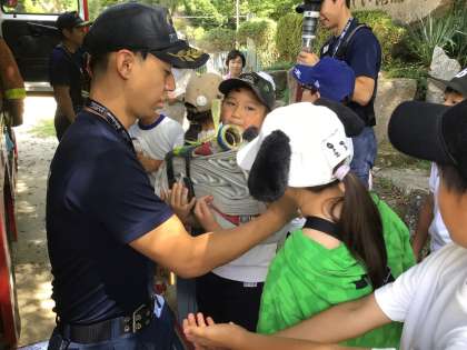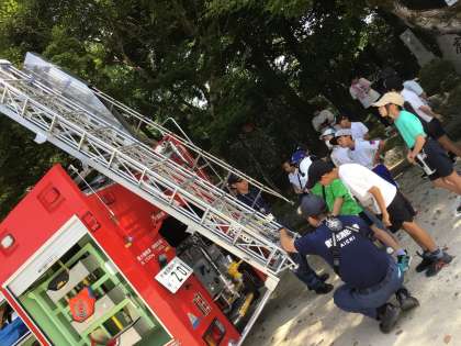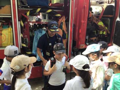 消防車の見学では管槍や二重巻きホース、酸素ボンベなどの装備を実際に持ったり着たりしました。