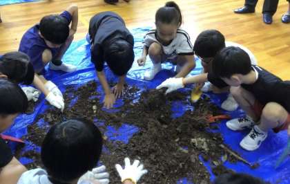 まず、愛知県野生生物保護実績発表大会での発表をしました。他校ともオンラインで繋ぎ、質問や感想をもらい交流しました。続いて、土壌生物発掘体験をしました。野鳥の森の土からたくさんの虫を見つけました。最後は、野鳥を讃える歌を歌いました。