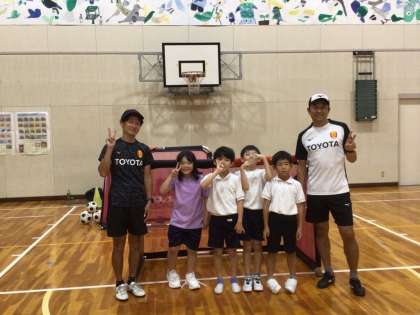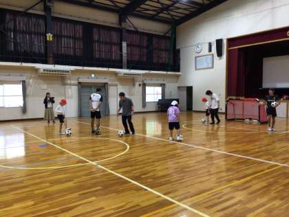 低学年の子どもたちが、グランパスのコーチからサッカーを楽しむための基本練習をしていました。