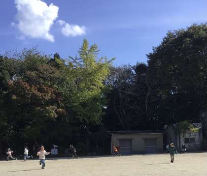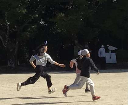 5・6年生の企画で、ハロウインの遊びとして全校鬼ごっこを行いました。仮装をした5・6年生が鬼役です。青空の下、思い切り運動場を駆け回っていました。