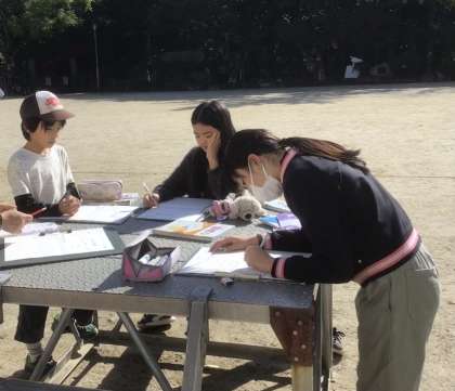 今日は、これまで学習してきたことを使って、1歩の歩幅を調べました。まず、10歩を歩いた距離を測ります。それを3回繰り返して、平均を求め自分の歩幅を出していました。