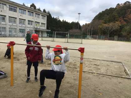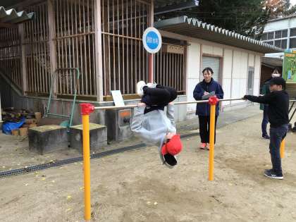 高学年は鉄棒の学習をしていました。自分の技を披露する場面では 真剣そのもの!