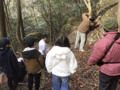 今日は、野鳥の森の岩について学習しました。石の専門家の方を講師にお招きし、お話を聞きました。大きな石が割れたり、そこから木が生えていたりする様子などを実際に見て説明を聞き、自然の力に感動していました。