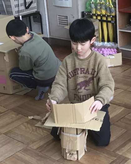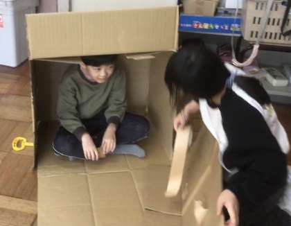 段ボールを切ったりつなげたりして、イメージを広げ、楽しく活動をしていました。