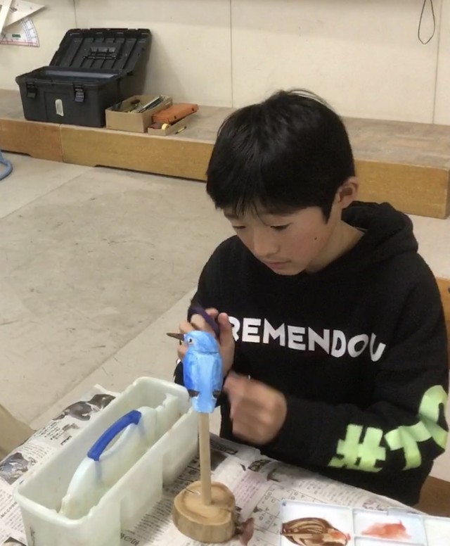 今日は、最終日です。形を作ってニスを塗った愛鳥に、色をつけました。できあがったバードカービングは、しばらく校内に展示します。