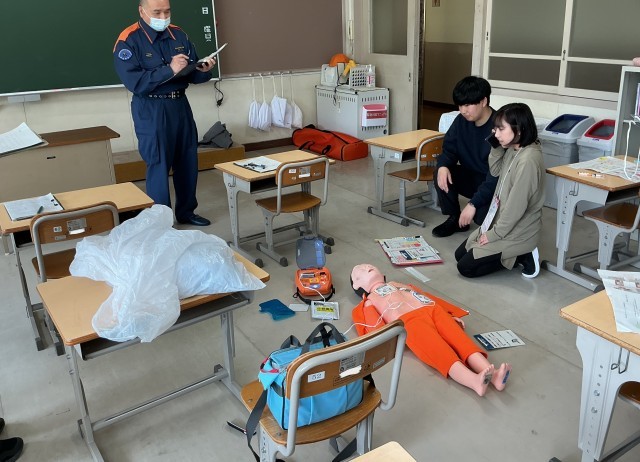 消防署の方を講師として来ていただき、先生方のシミュレーション研修(「子どもたちの命を守るため」)をしました。