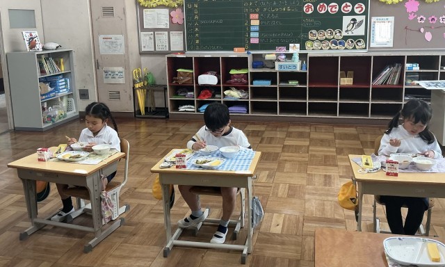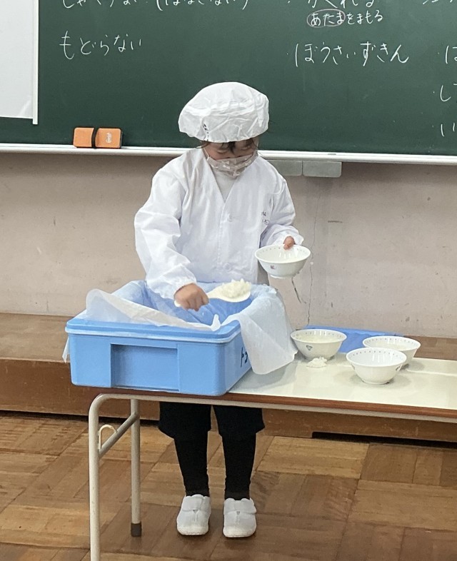 エプロンを着てマスクをつけて、配膳です。少しずつ慣れてきて、上手によそっていました。