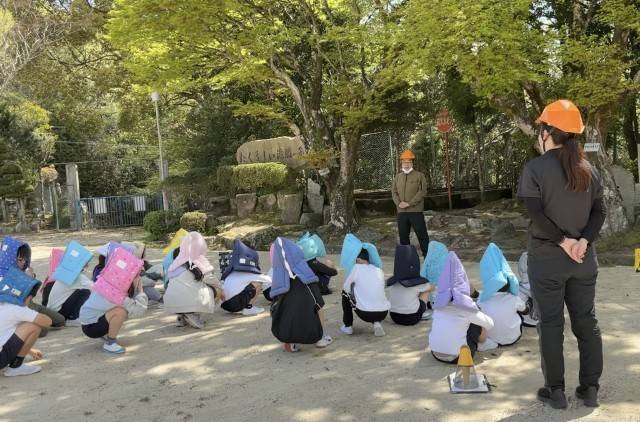 大きな地震の後、火災が発生した想定です。避難の合言葉を守り、静かに素早く避難できました。
