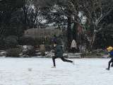 雪をものともせずサッカーボールを蹴ったり、先生にあてようと雪玉をつくったり、子...