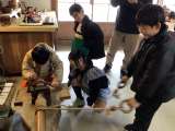 小原和紙について真剣に聞いています。コウゾを使ってトロロアオイと水で作ることを...