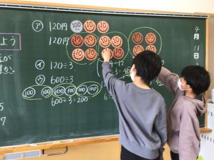 百円玉と十円玉を使って 公開日 2022/04/11 更新日 2022/04/11 各学年から 4年生が算数でわり算の学習をしています。 4年生最初の問題は、3個で120円のプリンの1個分の値段を求めます。 「120円は10円玉が12個分だから・・」と考えると簡単! と気付き、大きい数のわり算もできるようになりました。