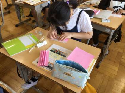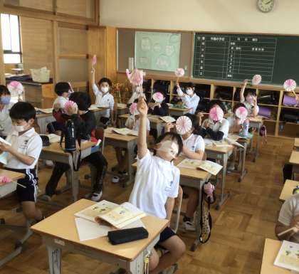 子どもたちが手にしているのは手作りの扇(作成時間約40分!)です。
