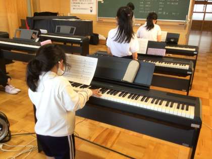 吹奏楽は感染症対策で管楽器ではなく鍵盤楽器ですが、どちらのクラブも子どもたちははりきって取り組んでいます。