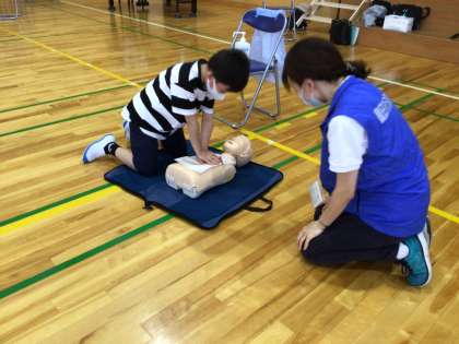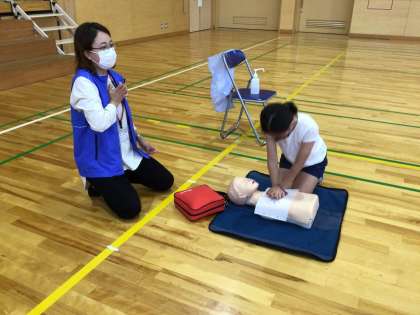 AEDの使い方と心肺蘇生法について学習し、胸骨圧迫を実際にやってみました。